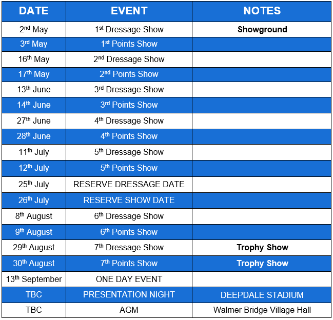All our events for 2026 will take place at the Showground, Moss Lane, Ulnes Walton, PR26 8LX, unless stated otherwise.