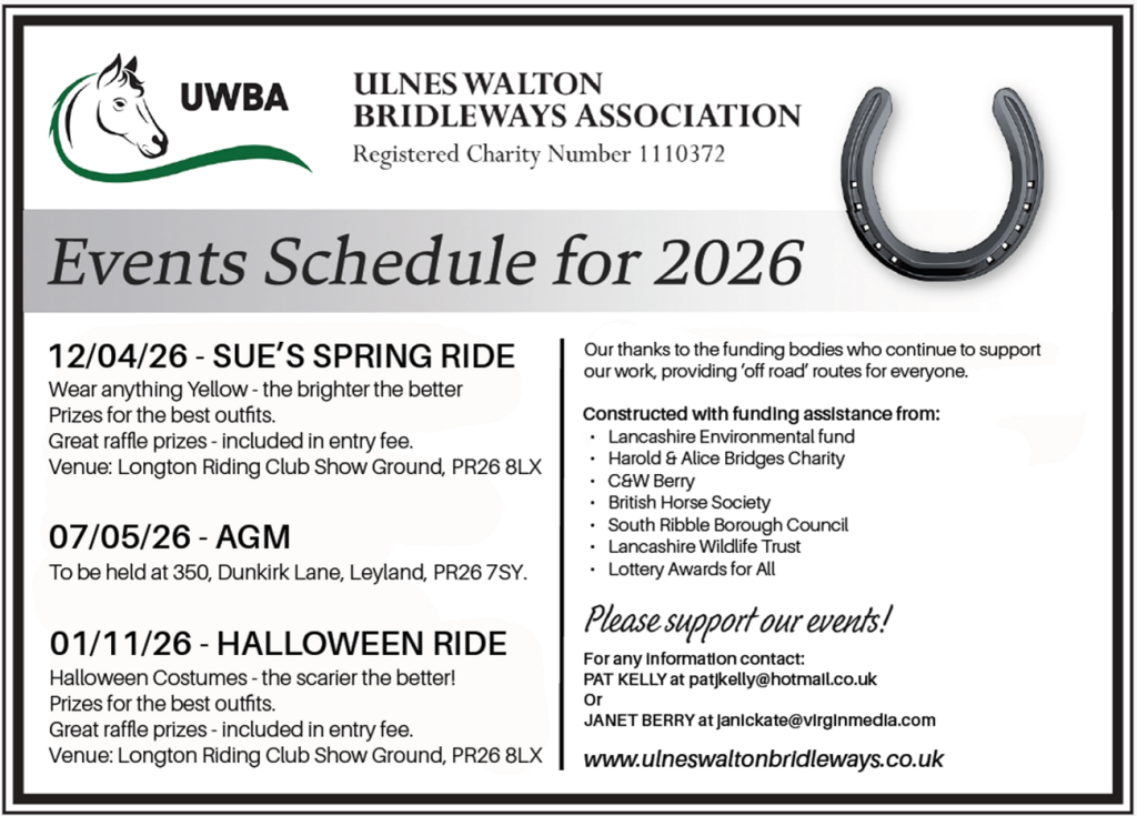 Ulnes Walton Bridleways are a Registered Charity, initially set up by a group of equestrian minded people, who were very concerned about the safety of riders using busy roads in an area which had no bridleways.